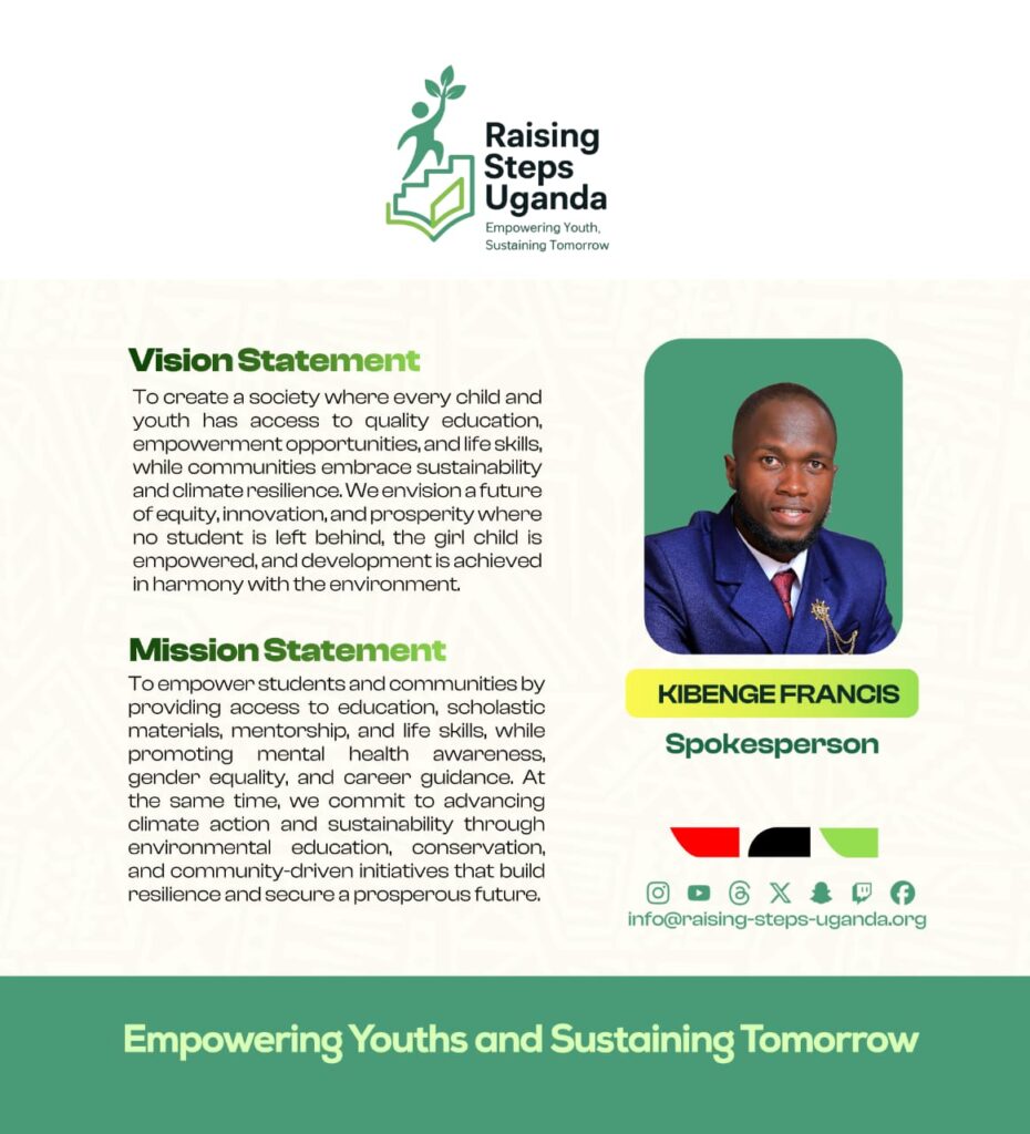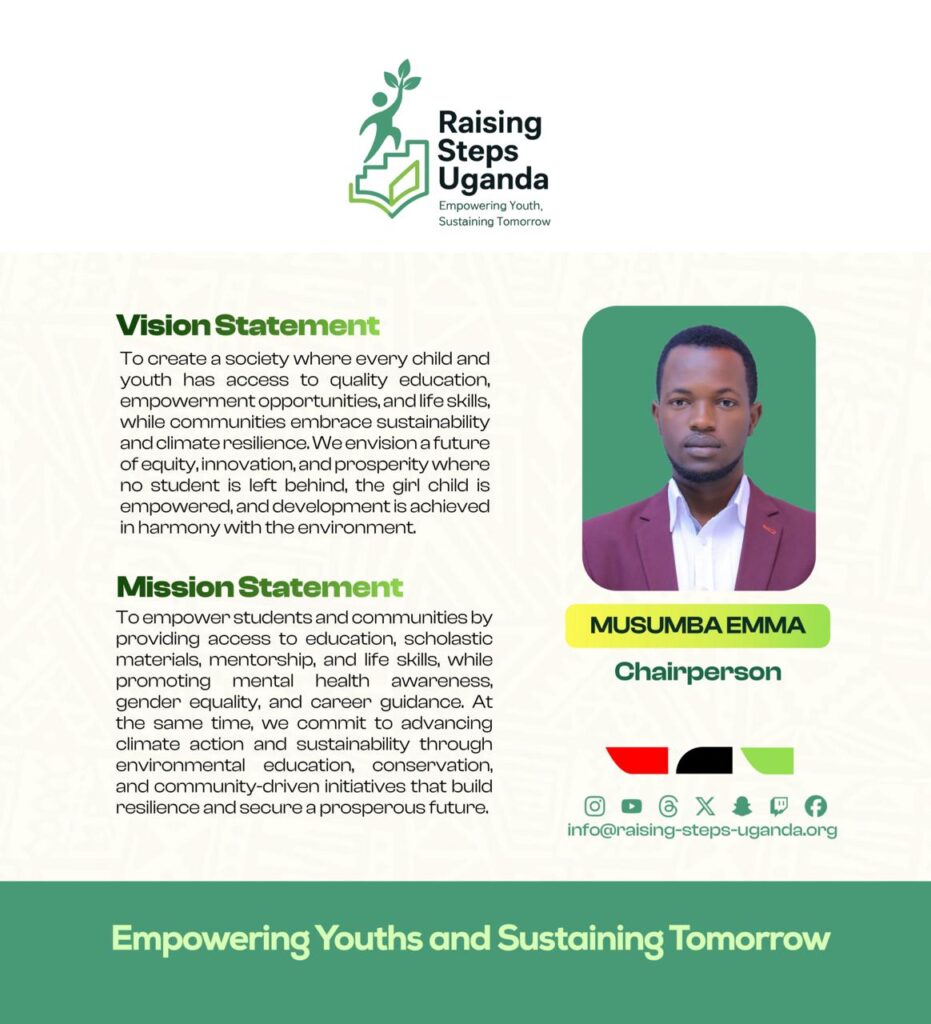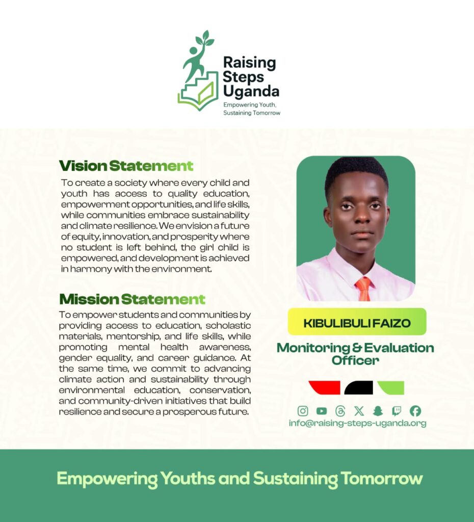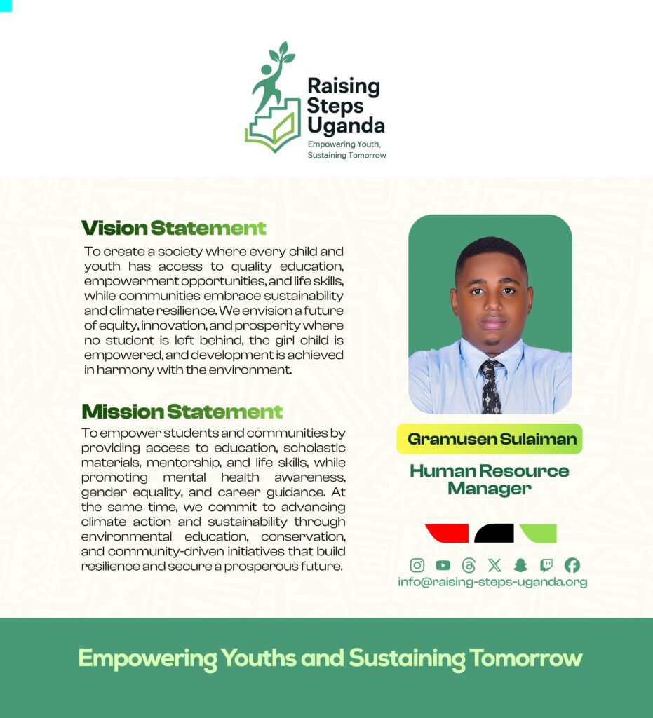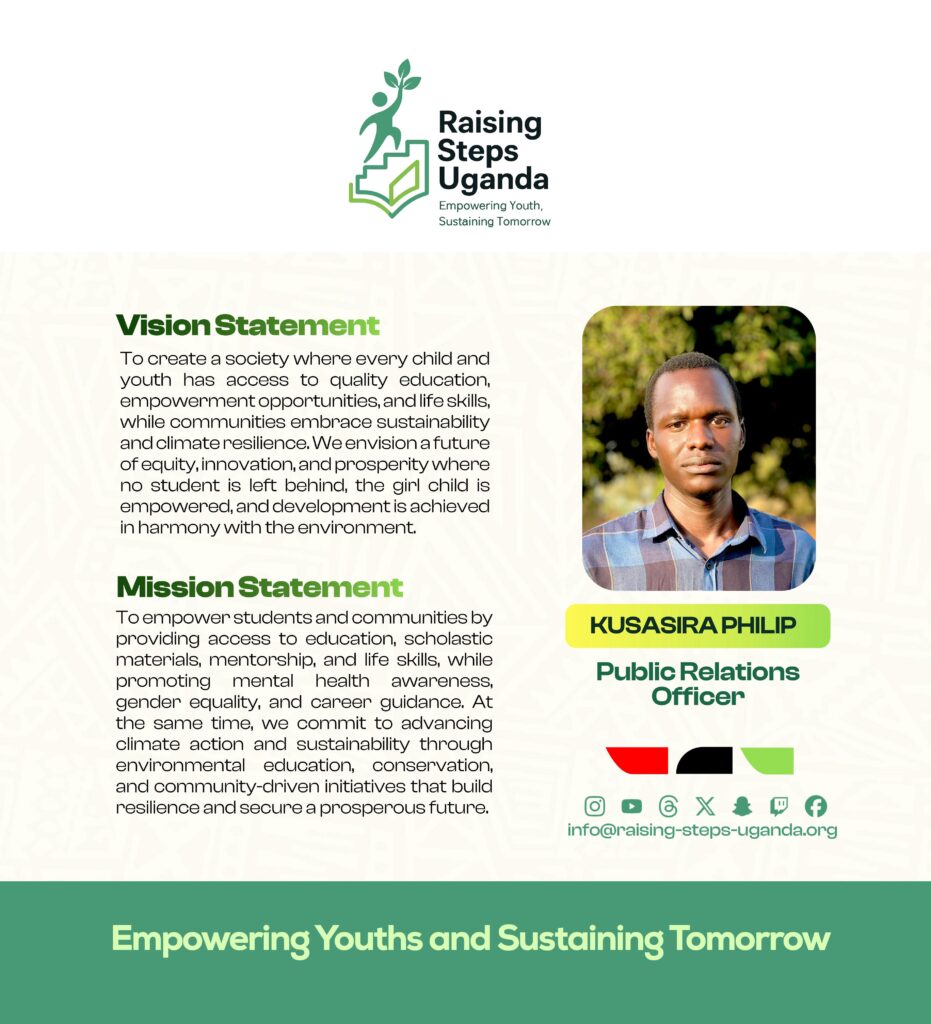 Raising Steps Uganda is a beacon of hope tirelessly working to empower and uplift vulnerable communities especially the learners through an integrated approach to Education and Climate action. The Organization’s commitment to improving the lives of learners is reflected in its diverse programs that promote not only Education access but also personal growth and resilience. At the core of Raising Steps Uganda is the drive to Education Empowerment and Climate Sustainability, we provide vital scholastic materials and foster an environment where career guidance and counselling thrive, the Organization ensures that learners are equipped to succeed in both school and life. With a keen focus on raising awareness about crucial issues such as teenage pregnancy, school dropout, mental health, hygiene and child rights.