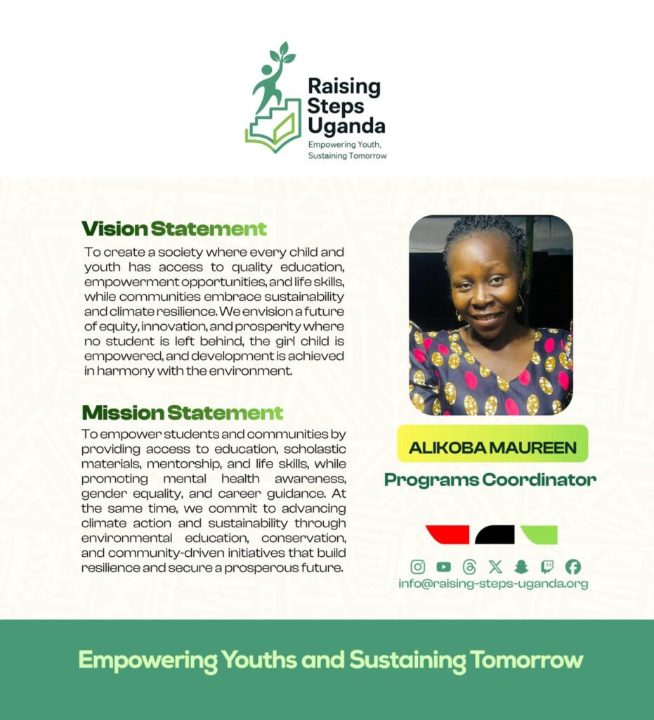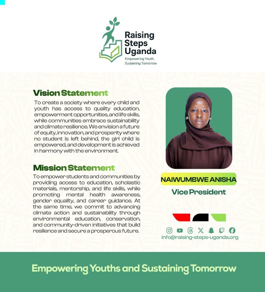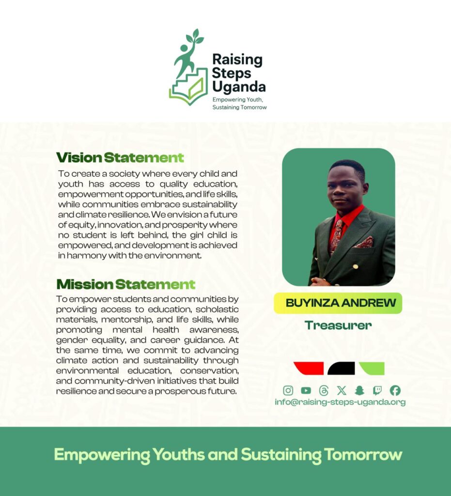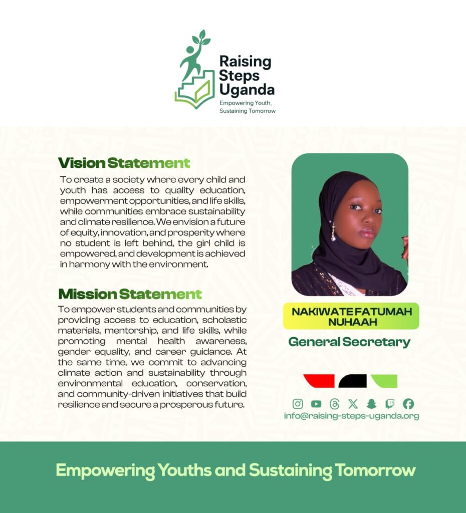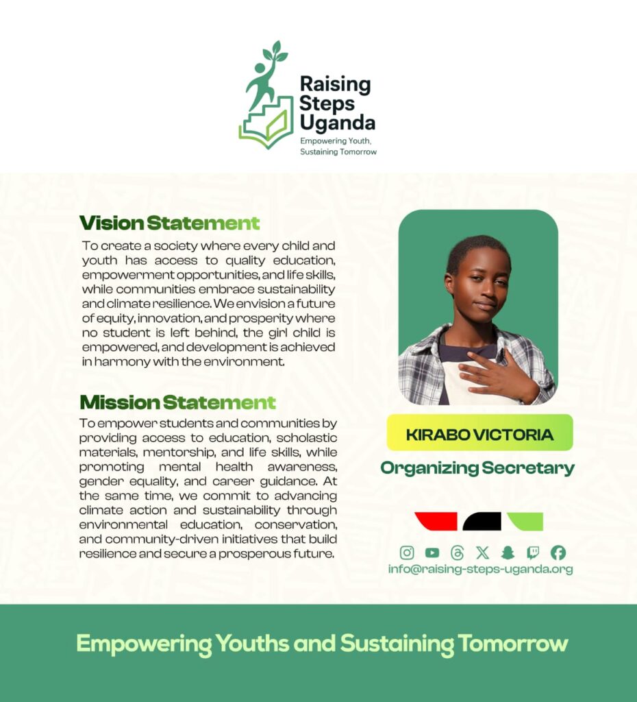 Raising Steps Uganda is a beacon of hope tirelessly working to empower and uplift vulnerable communities especially the learners through an integrated approach to Education and Climate action. The Organization’s commitment to improving the lives of learners is reflected in its diverse programs that promote not only Education access but also personal growth and resilience. At the core of Raising Steps Uganda is the drive to Education Empowerment and Climate Sustainability, we provide vital scholastic materials and foster an environment where career guidance and counselling thrive, the Organization ensures that learners are equipped to succeed in both school and life. With a keen focus on raising awareness about crucial issues such as teenage pregnancy, school dropout, mental health, hygiene and child rights.